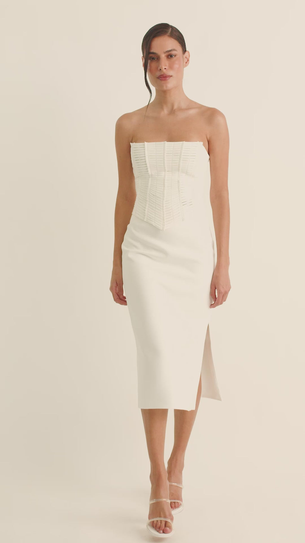 Corset em tecido estruturado. Desenvolvido com modelagem estratégica que oferece sustentação ao busto e valoriza a silhueta com precisão. A parte frontal é composta por vieses aplicados manualmente, cuidadosamente posicionados para seguir as linhas do corpo e reforçar o ajuste anatômico. O fechamento é feito nas costas por meio de ilhoses e amarração, permitindo ajuste personalizado e firmeza na vestibilidade.