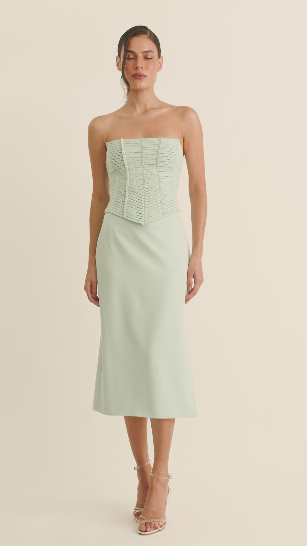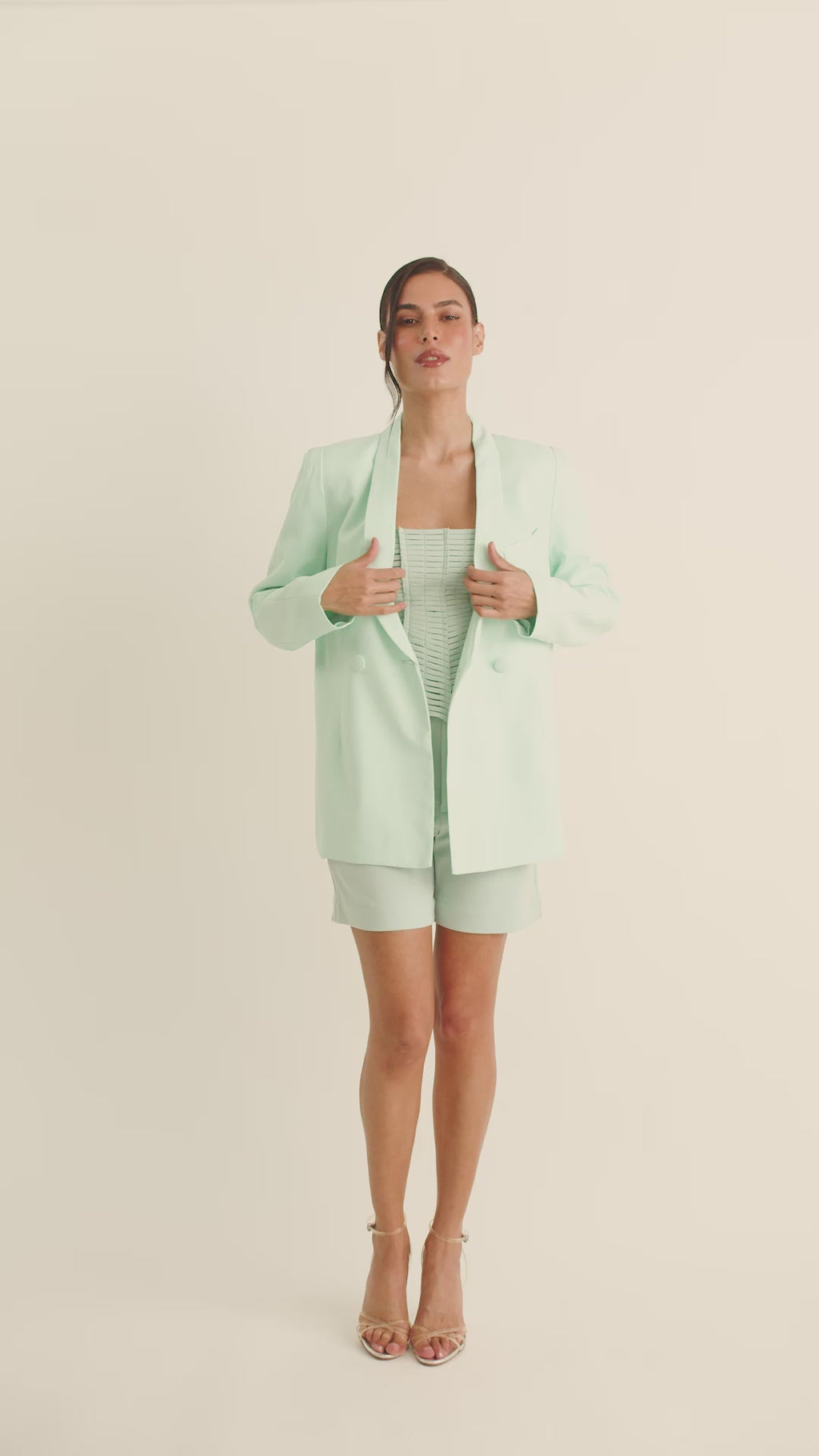 Corset em tecido estruturado. Desenvolvido com modelagem estratégica que oferece sustentação ao busto e valoriza a silhueta com precisão. A parte frontal é composta por vieses aplicados manualmente, cuidadosamente posicionados para seguir as linhas do corpo e reforçar o ajuste anatômico. O fechamento é feito nas costas por meio de ilhoses e amarração, permitindo ajuste personalizado e firmeza na vestibilidade.