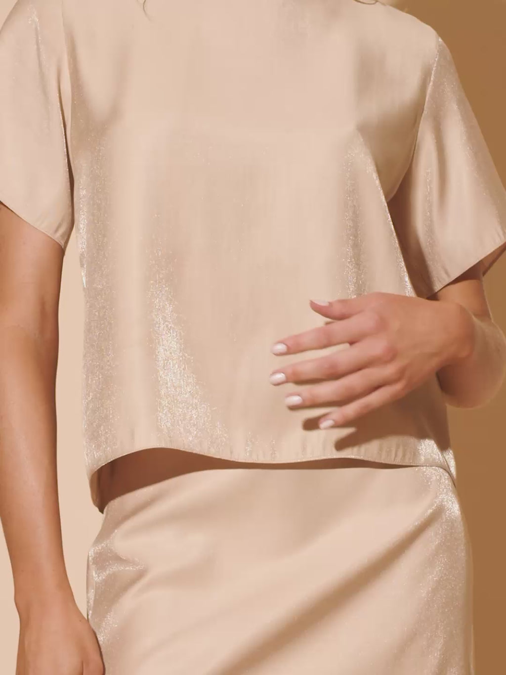 Saia em tecido estruturado com leve brilho acetinado. Possui modelagem reta com cintura intermediária e acabamento limpo. A peça é totalmente forrada no próprio tecido. Fechamento por zíper invisível no centro das costas, garantindo acabamento discreto e uniforme.